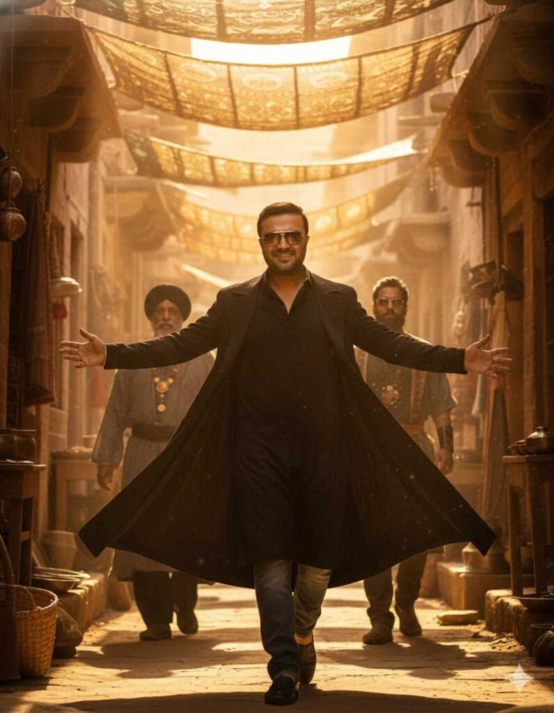 This image concept is designed to create a striking, movie-like villain introduction inspired by powerful Bollywood entry scenes. The focus is on authority, confidence, and an intimidating screen presence that immediately captures attention. The atmosphere reflects intensity and dominance, as if the character has just stepped into the frame during a high-stakes moment.