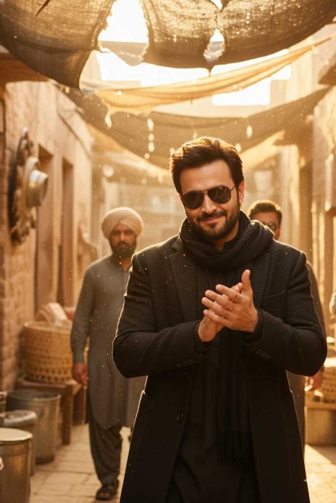 The visual setting emphasizes desert-inspired architecture with aged sandstone lanes, warm earthy colors, dramatic sunlight, and dust-filled air to enhance realism. The main character remains extremely sharp and detailed, while supporting figures are kept slightly out of focus to visually establish hierarchy. The final result should feel like a paused frame from a big-budget action or crime film, where storytelling, realism, and attitude merge into one impactful shot.